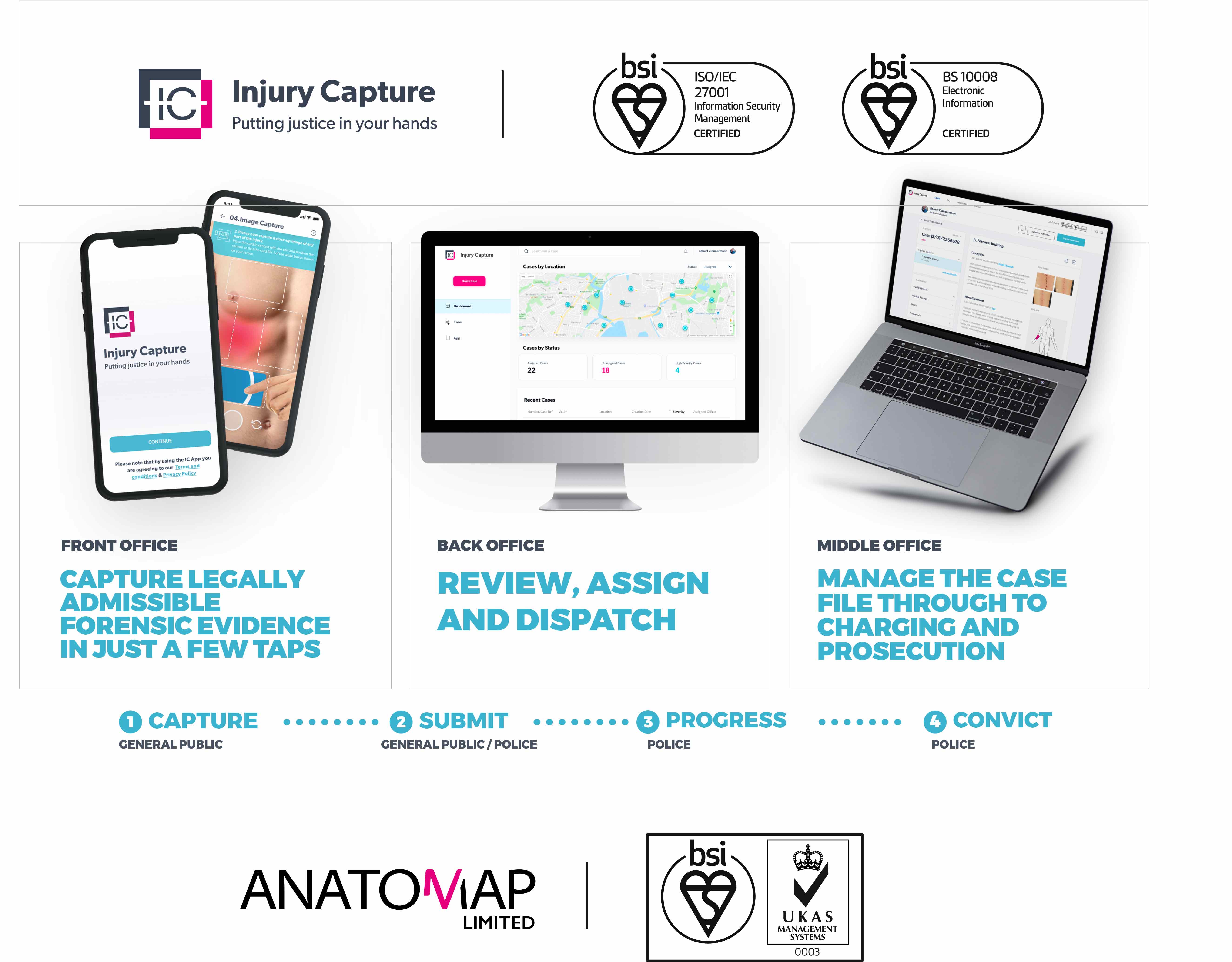 With full certification we can now proudly release our first app, Injury Capture for public use. With our users assured that the information we handle is secure and that all electronic information which is captured via the collection of Anatomap Applications (including the Injury Capture app), and stored, transferred and produced by Anatomap, can safely be used as evidential legally admissible evidence in any form of litigation.